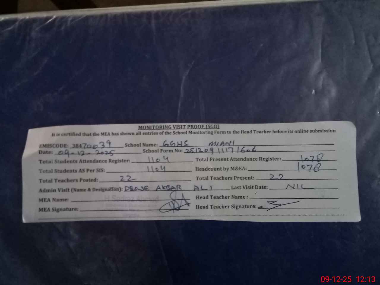 | Attendance Register | Head Teacher | MEA with School | Visit Proof |