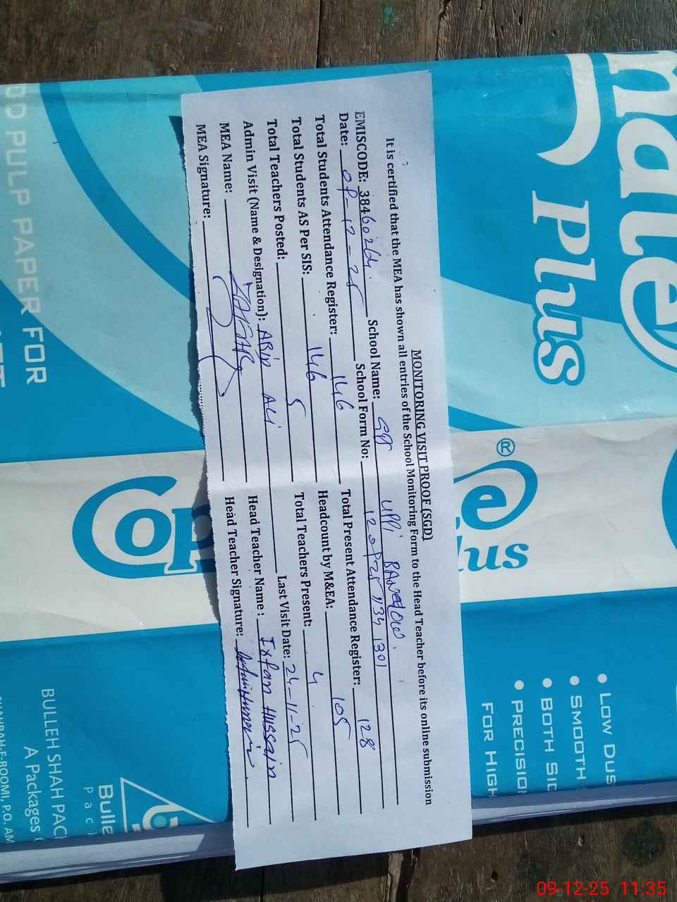 | Attendance Register | Head Teacher | MEA with School | Visit Proof |