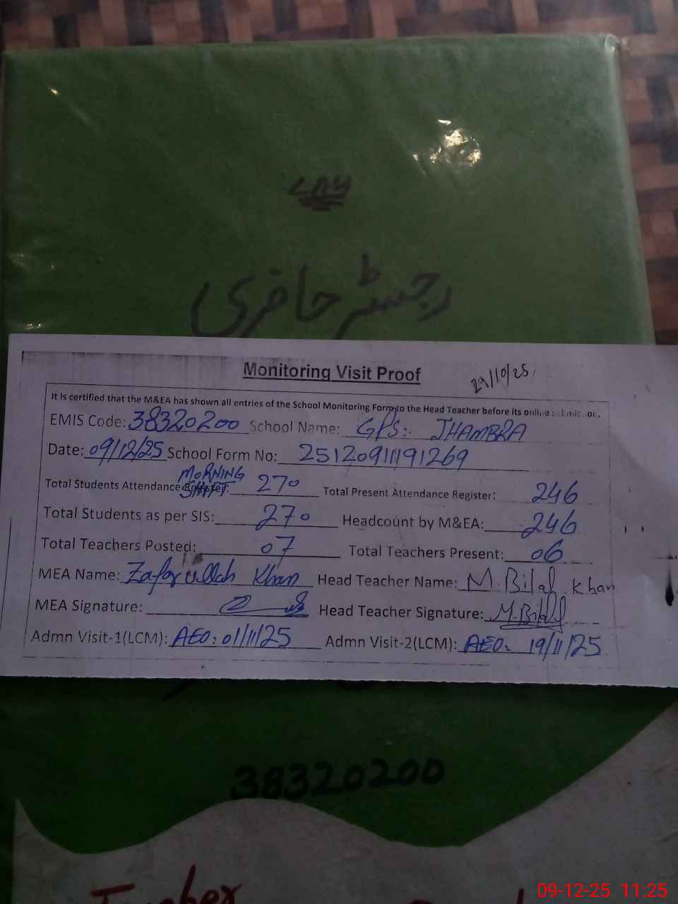 | Attendance Register | Head Teacher | MEA with School | Visit Proof |