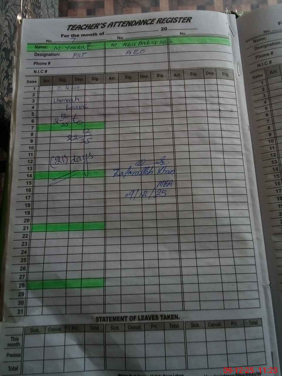 | CNIC | Full Name | Designation | R/C | Absence During Last Calender Month |