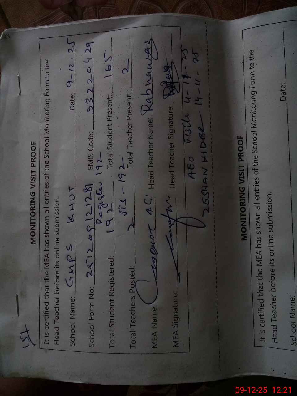 | Attendance Register | Head Teacher | MEA with School | Visit Proof |