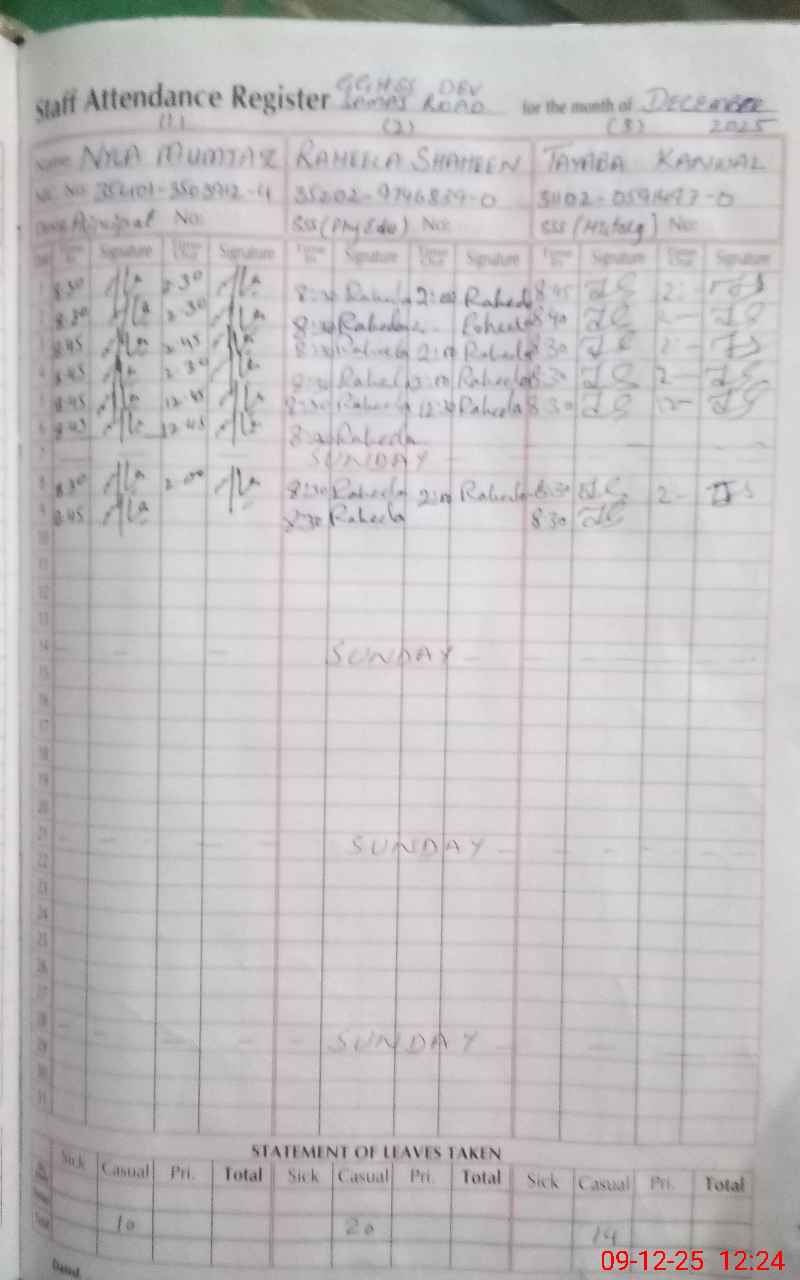 | CNIC | Full Name | Designation | R/C | Absence During Last Calender Month |