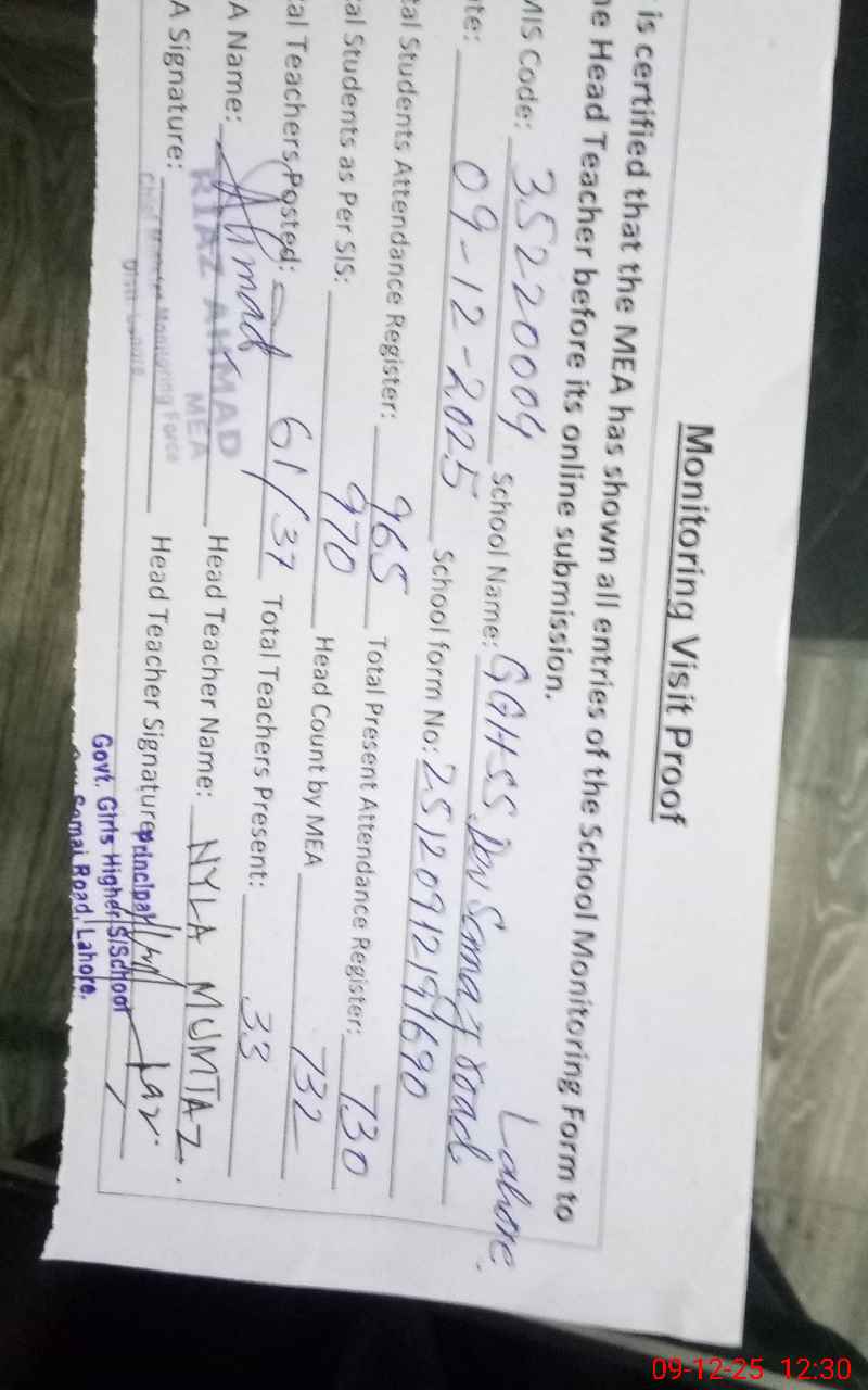| Attendance Register | Head Teacher | MEA with School | Visit Proof |