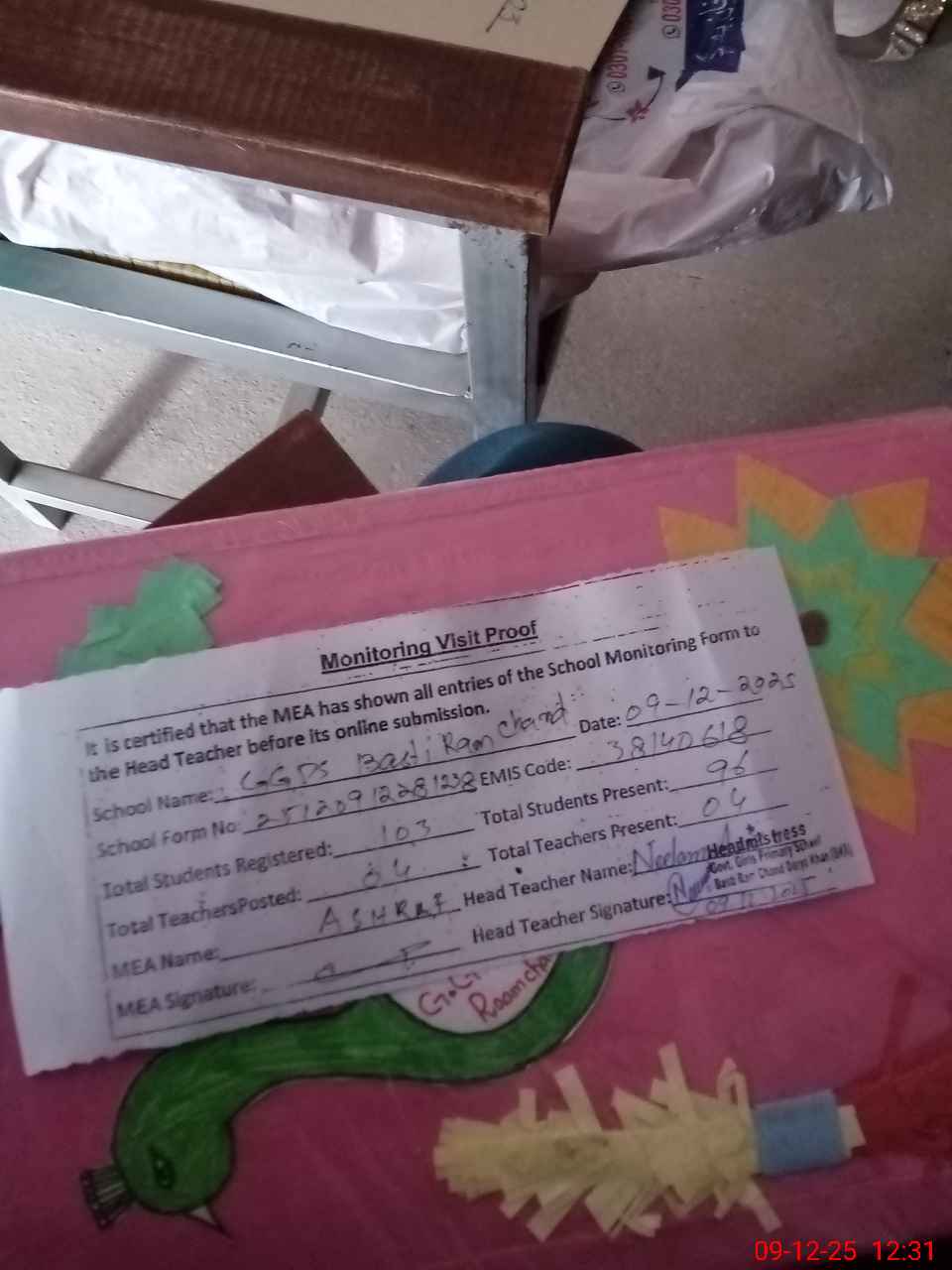 | Attendance Register | Head Teacher | MEA with School | Visit Proof |