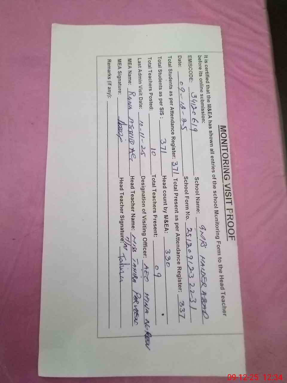 | Attendance Register | Head Teacher | MEA with School | Visit Proof |