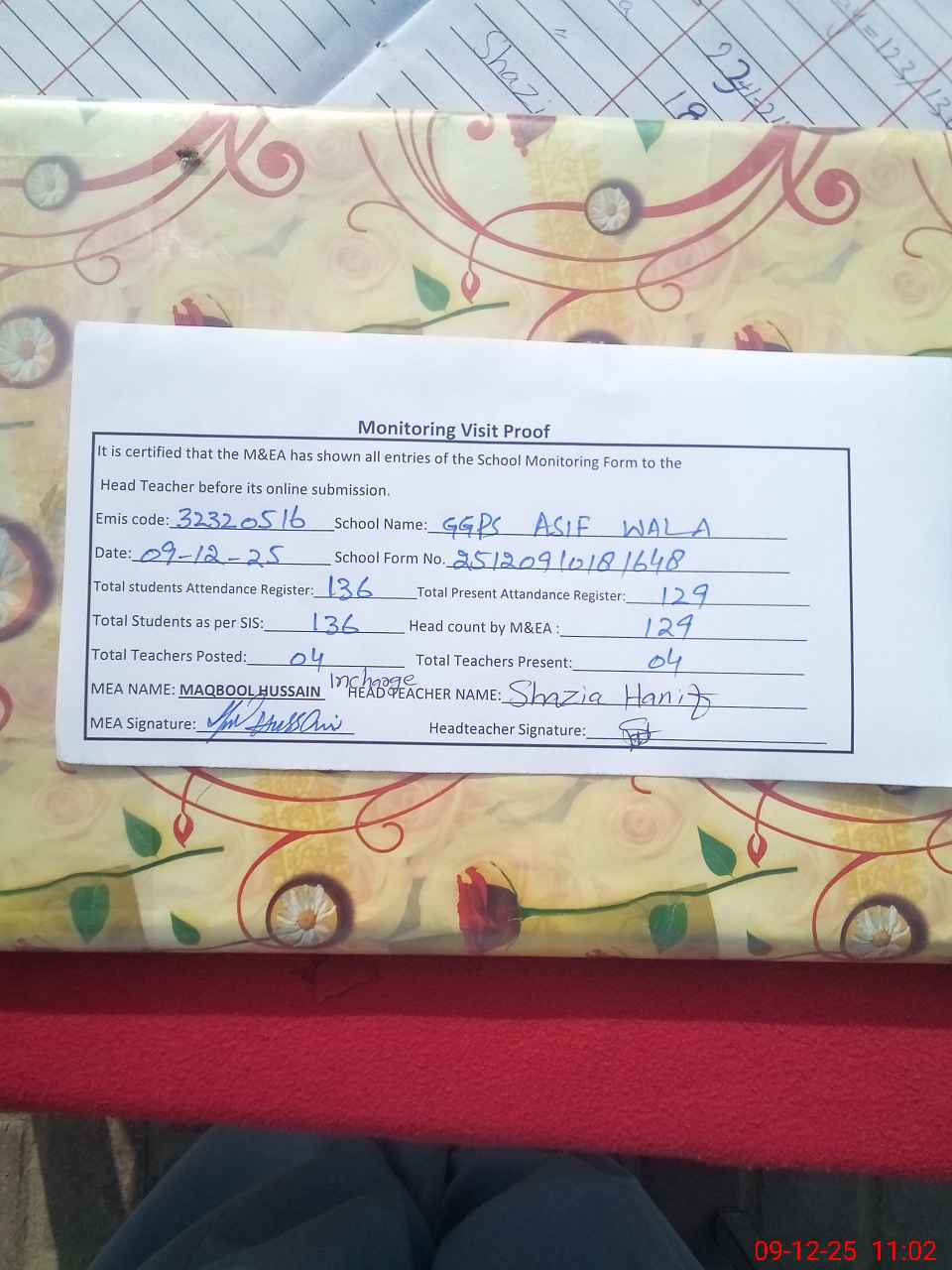 | EMIS Code: 32320516 | Name of School: GGPS ASIF WALA | |||