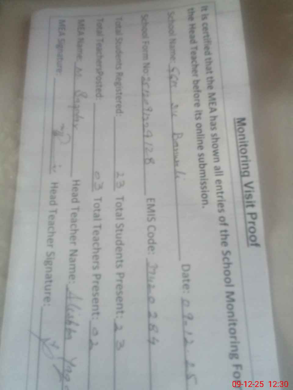 | Attendance Register | Head Teacher | MEA with School | Visit Proof |