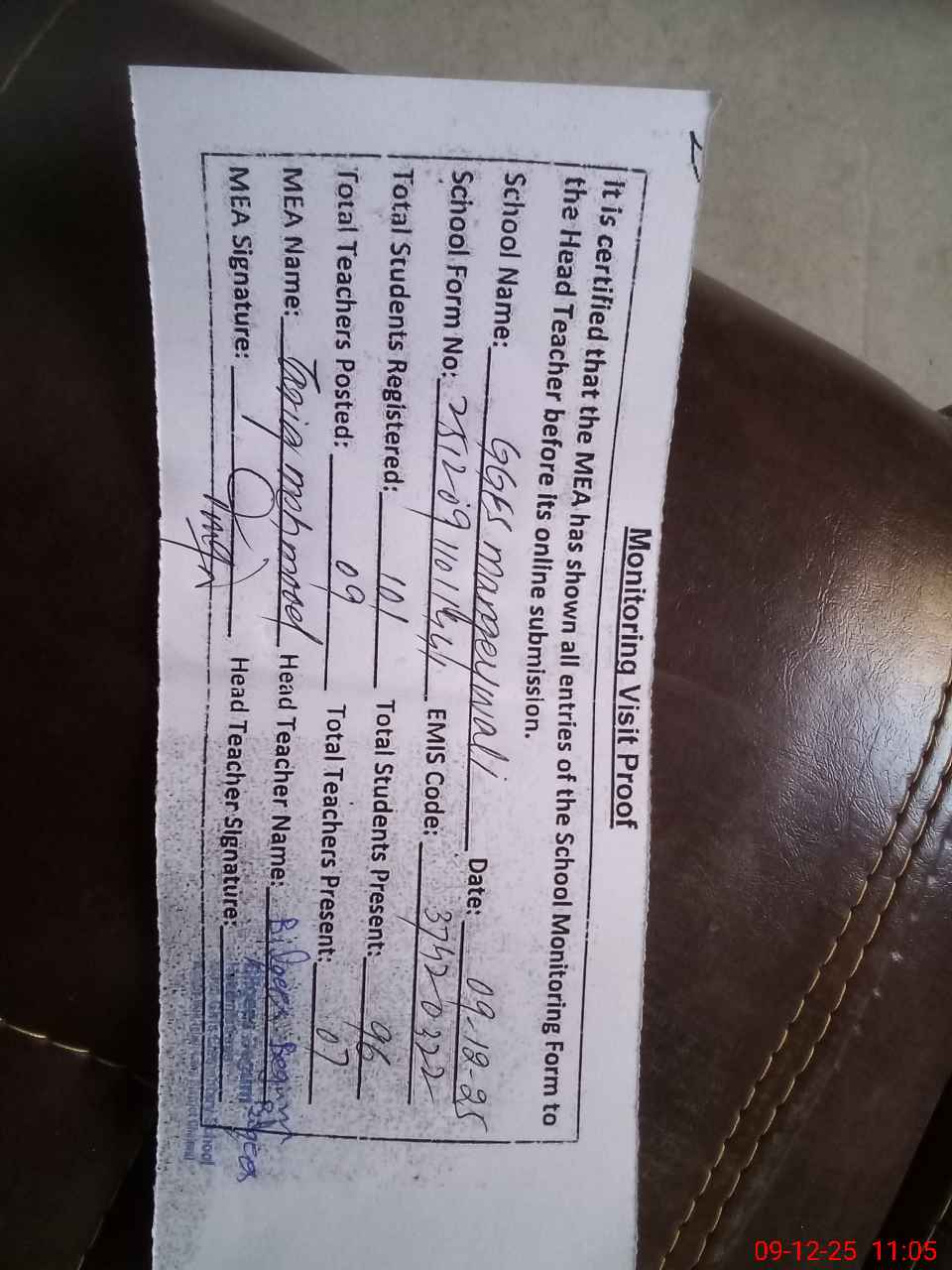 | Attendance Register | Head Teacher | MEA with School | Visit Proof |