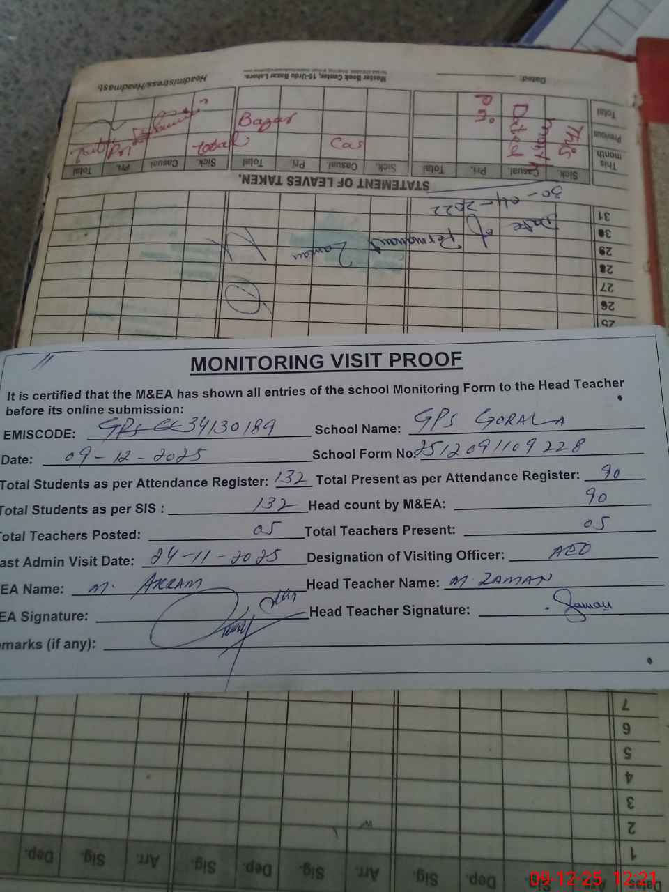 | Attendance Register | Head Teacher | MEA with School | Visit Proof |