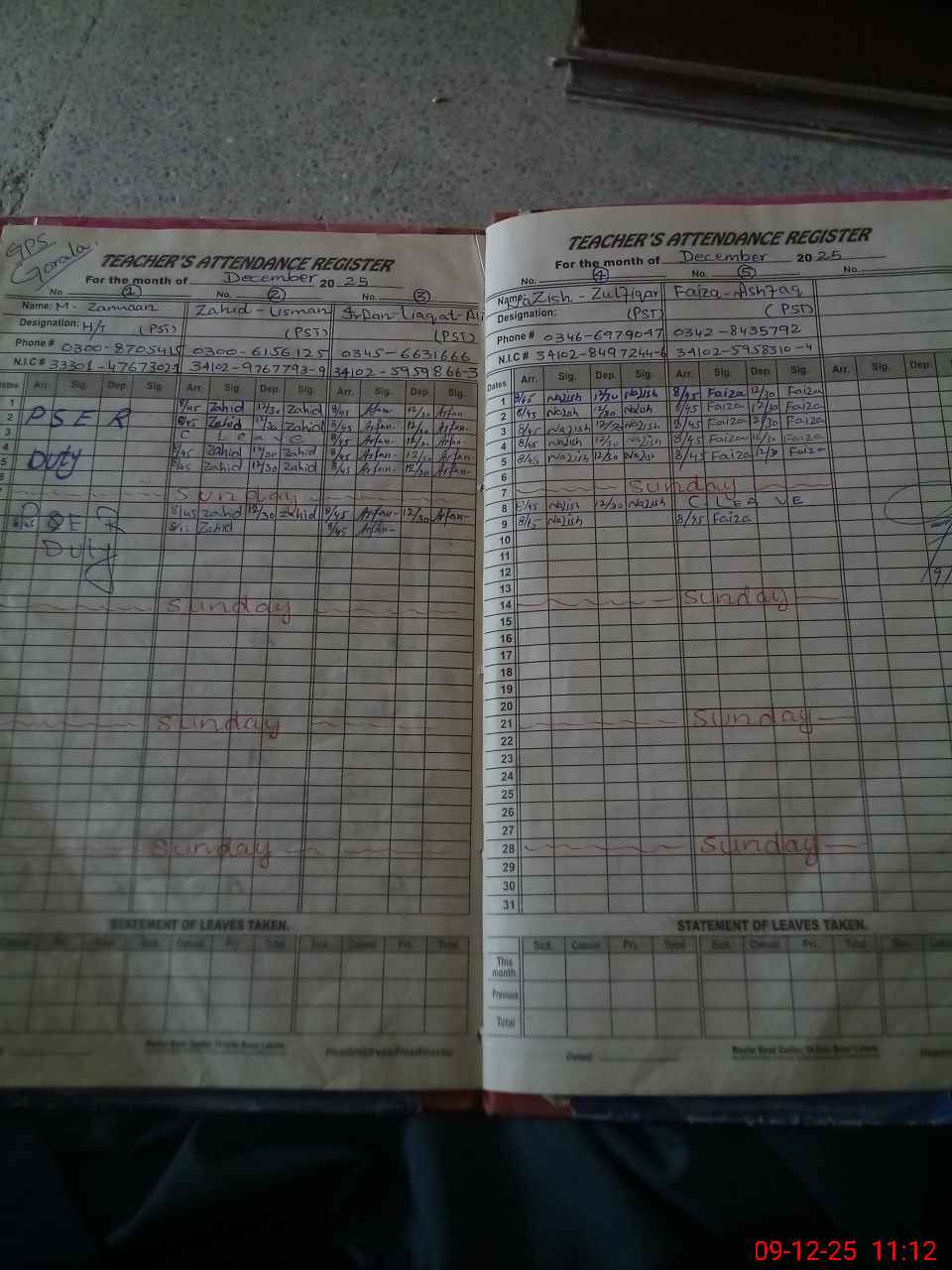 | CNIC | Full Name | Designation | R/C | Absence During Last Calender Month |