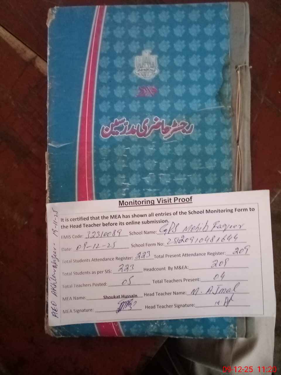 | Attendance Register | Head Teacher | MEA with School | Visit Proof |