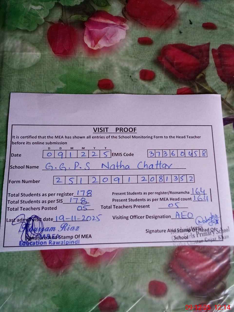 | Attendance Register | Head Teacher | MEA with School | Visit Proof |