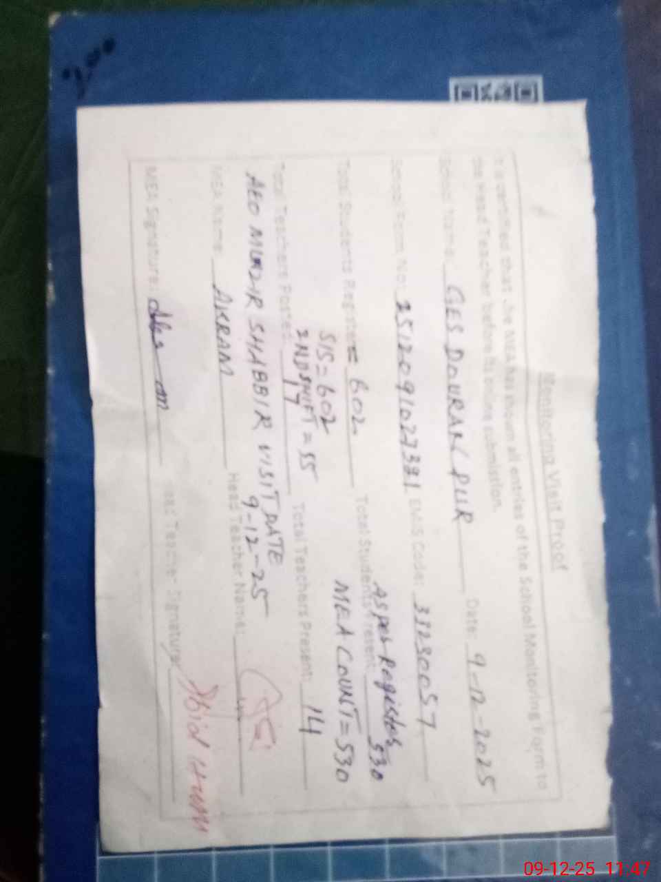 | Attendance Register | Head Teacher | MEA with School | Visit Proof |
