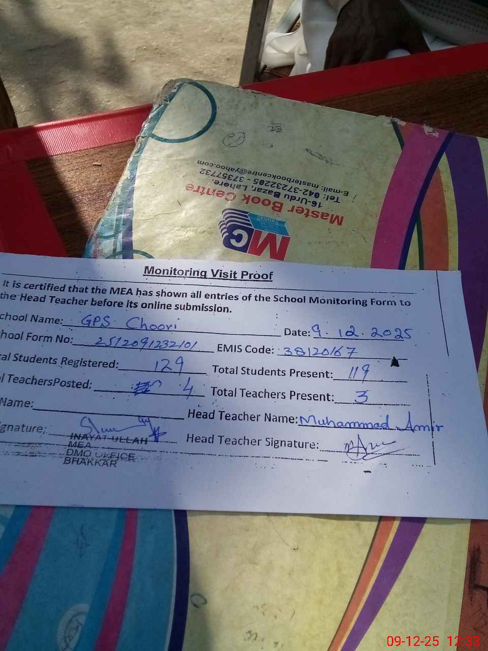 | Attendance Register | Head Teacher | MEA with School | Visit Proof |