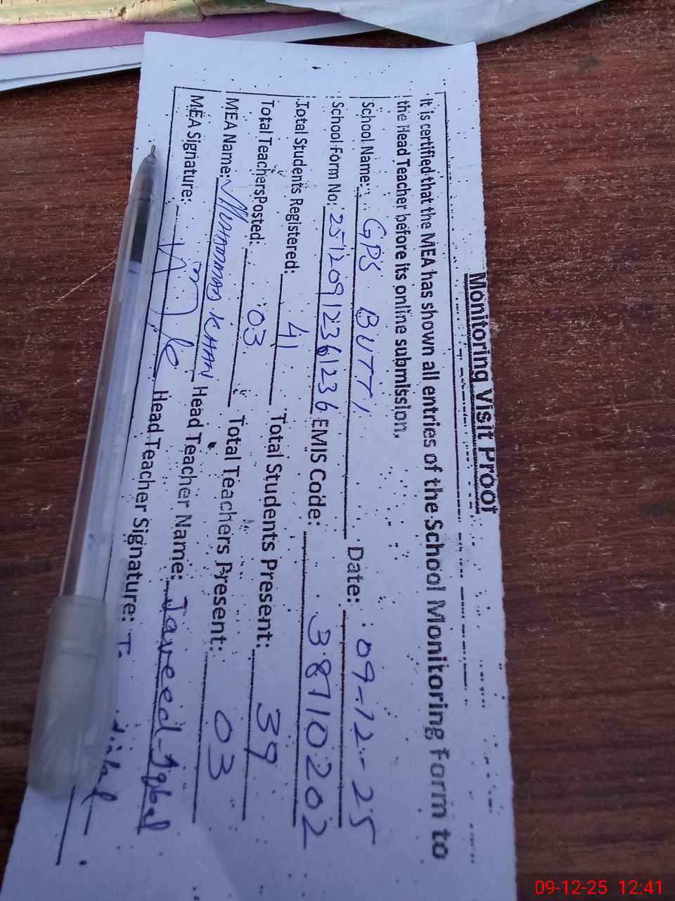 | Attendance Register | Head Teacher | MEA with School | Visit Proof |