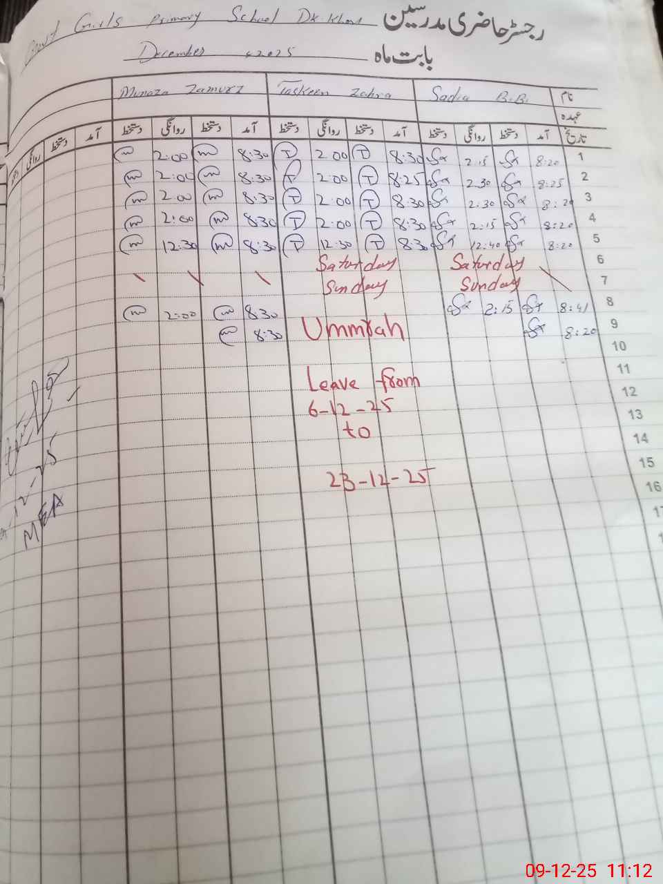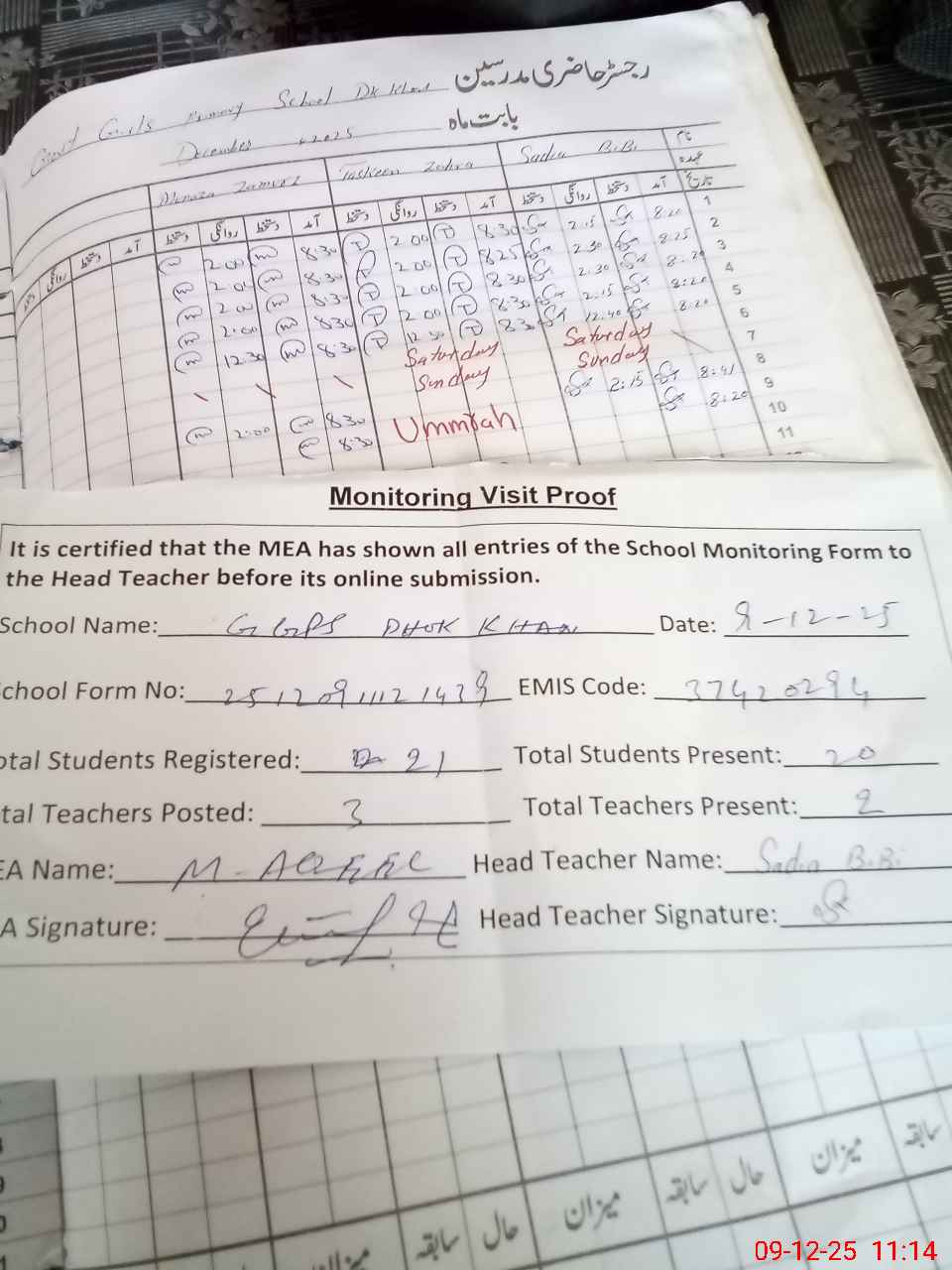| Attendance Register | Head Teacher | MEA with School | Visit Proof |