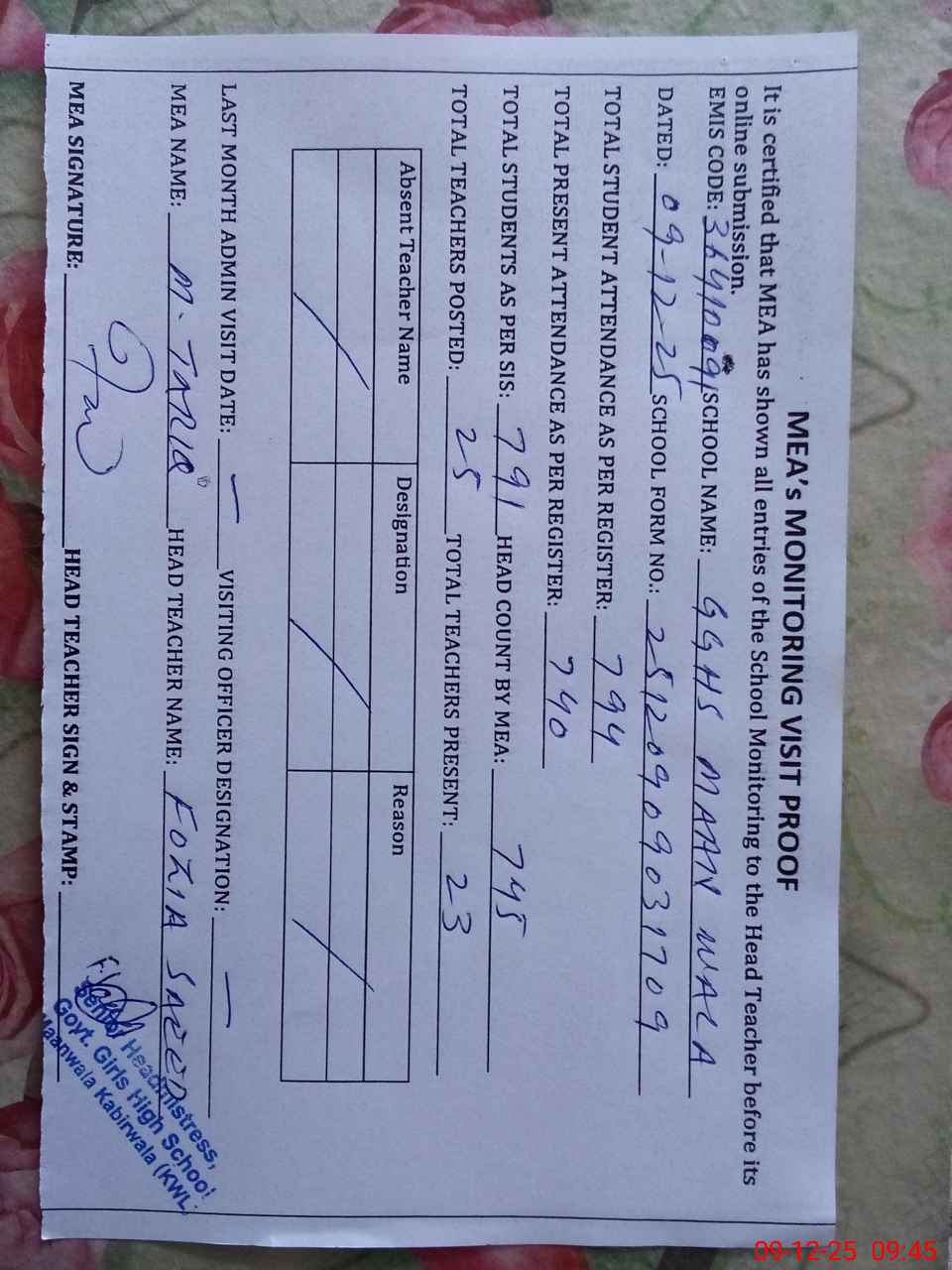 | EMIS Code: 36410091 | Name of School: GGHS MAAN WALA, KABIRWALA | |||