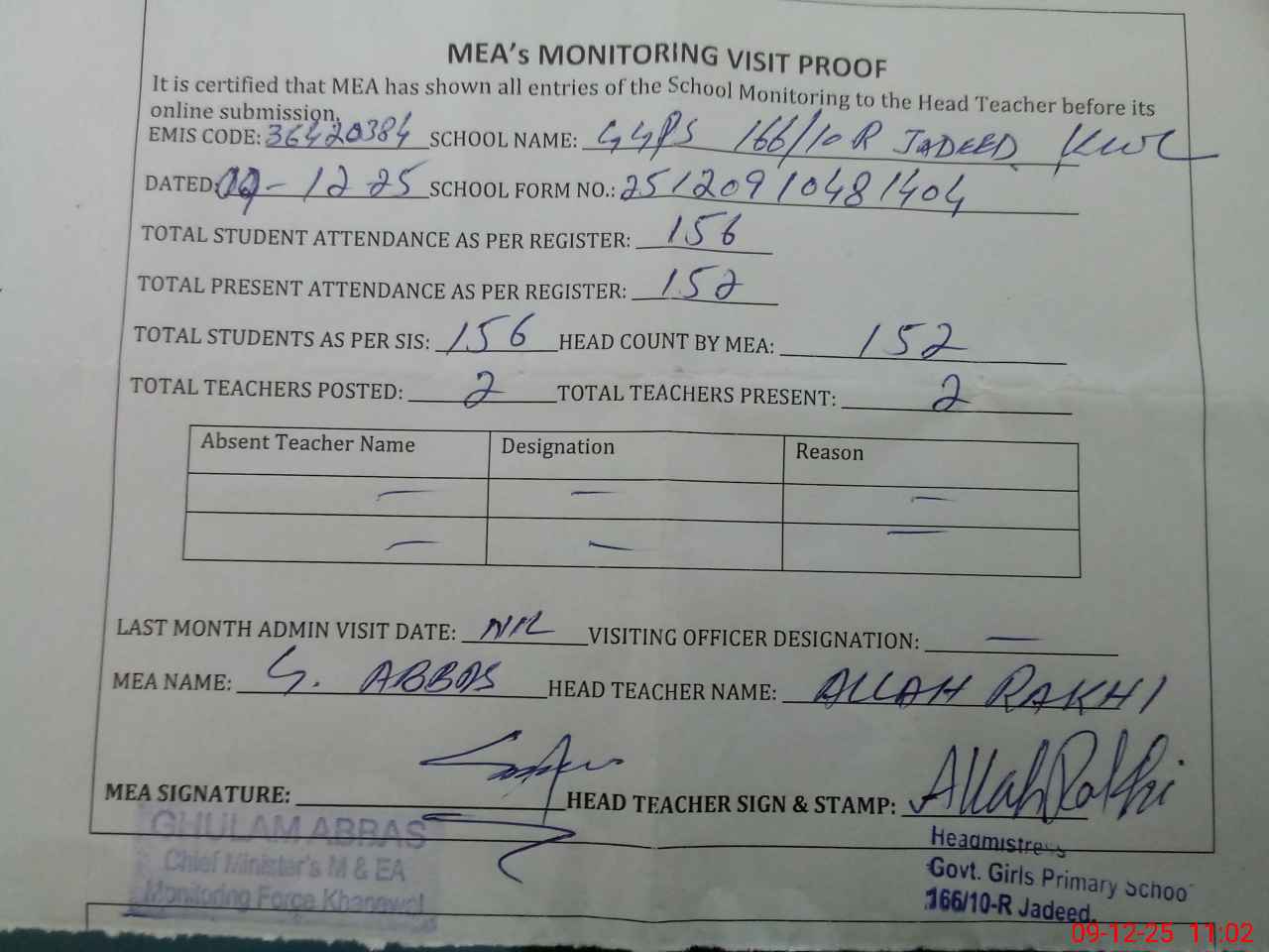 | Attendance Register | Head Teacher | MEA with School | Visit Proof |
