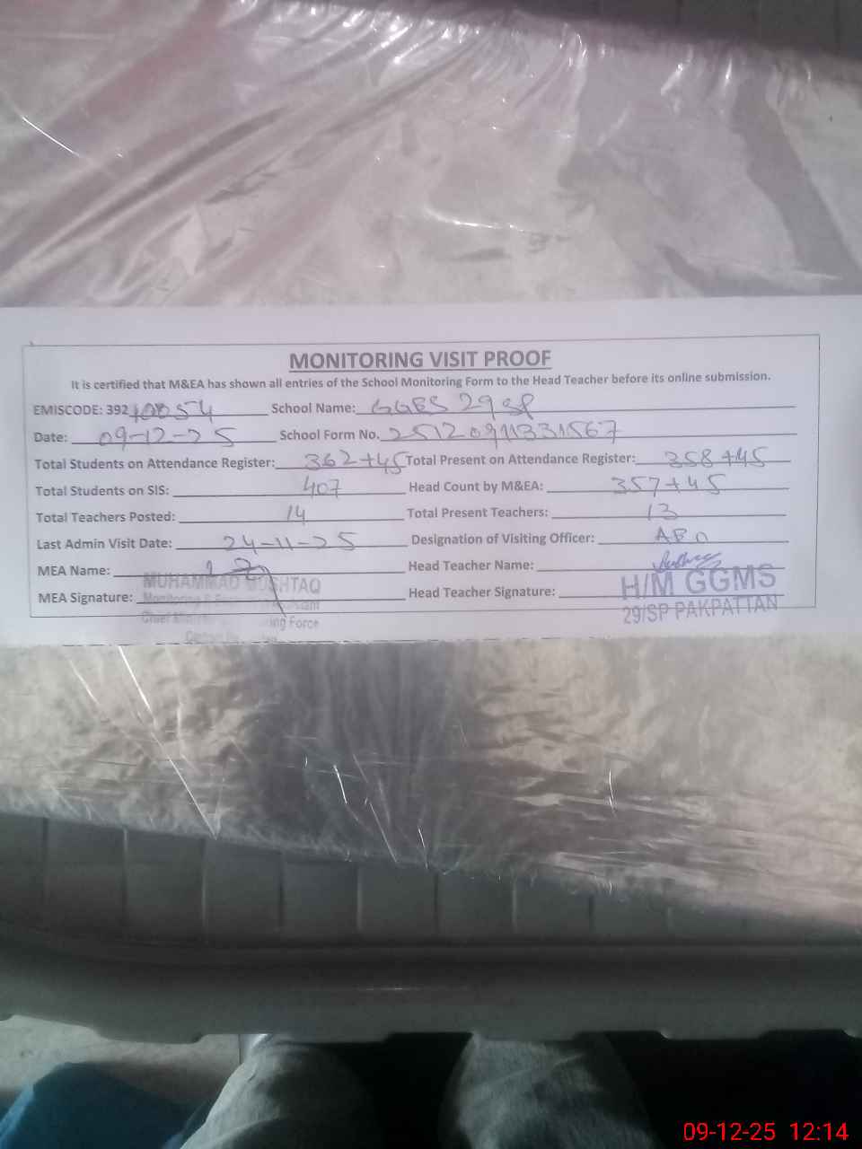 | Attendance Register | Head Teacher | MEA with School | Visit Proof |