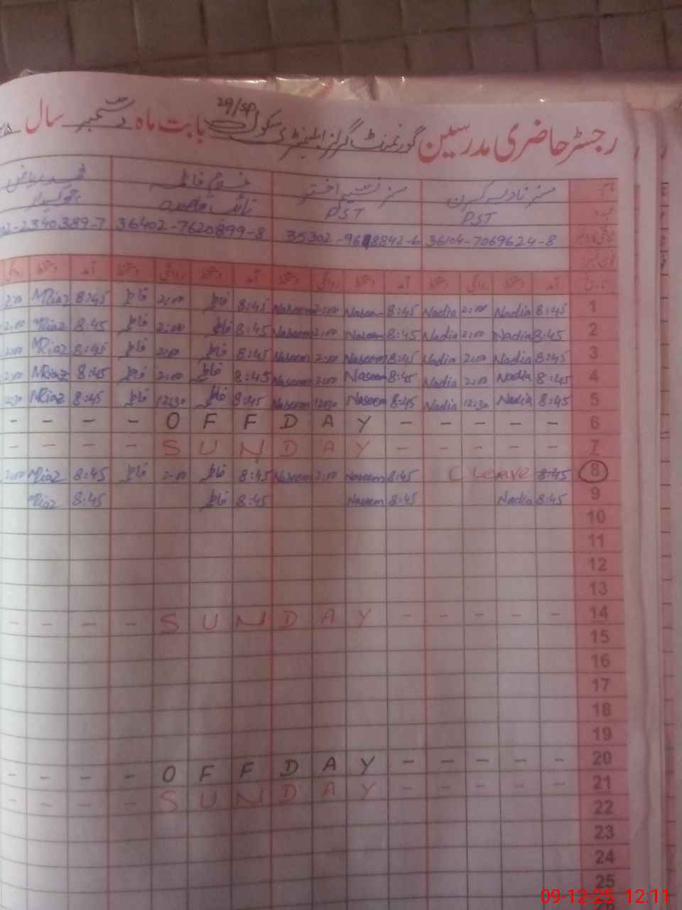 | CNIC | Full Name | Designation | R/C | Absence During Last Calender Month |