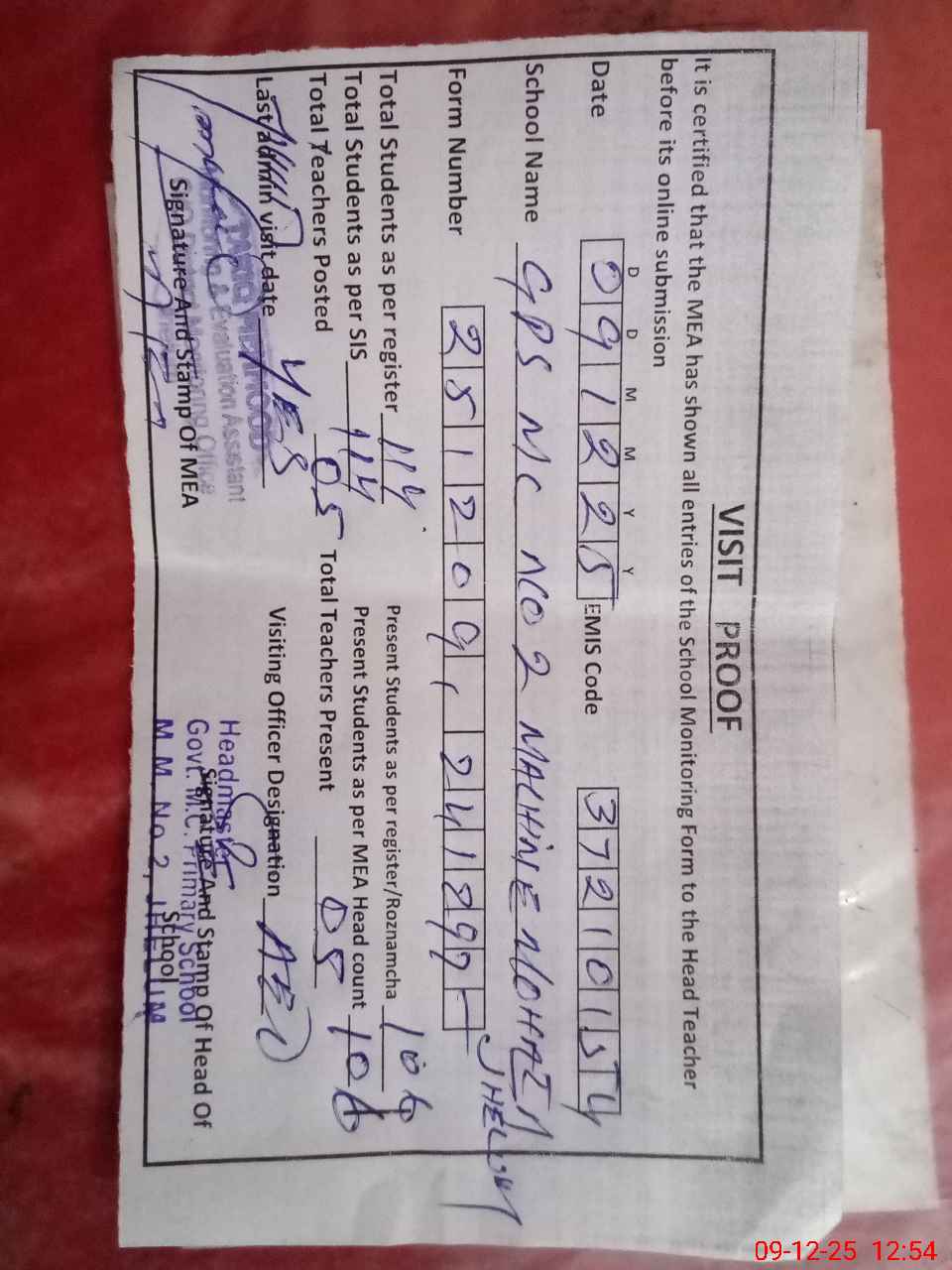 | Attendance Register | Head Teacher | MEA with School | Visit Proof |