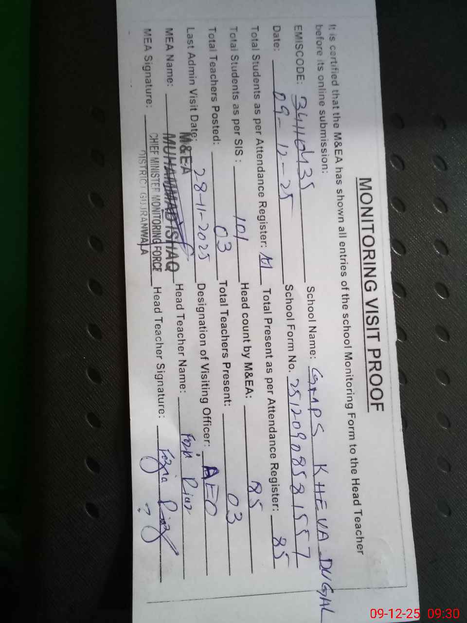 | Attendance Register | Head Teacher | MEA with School | Visit Proof |
