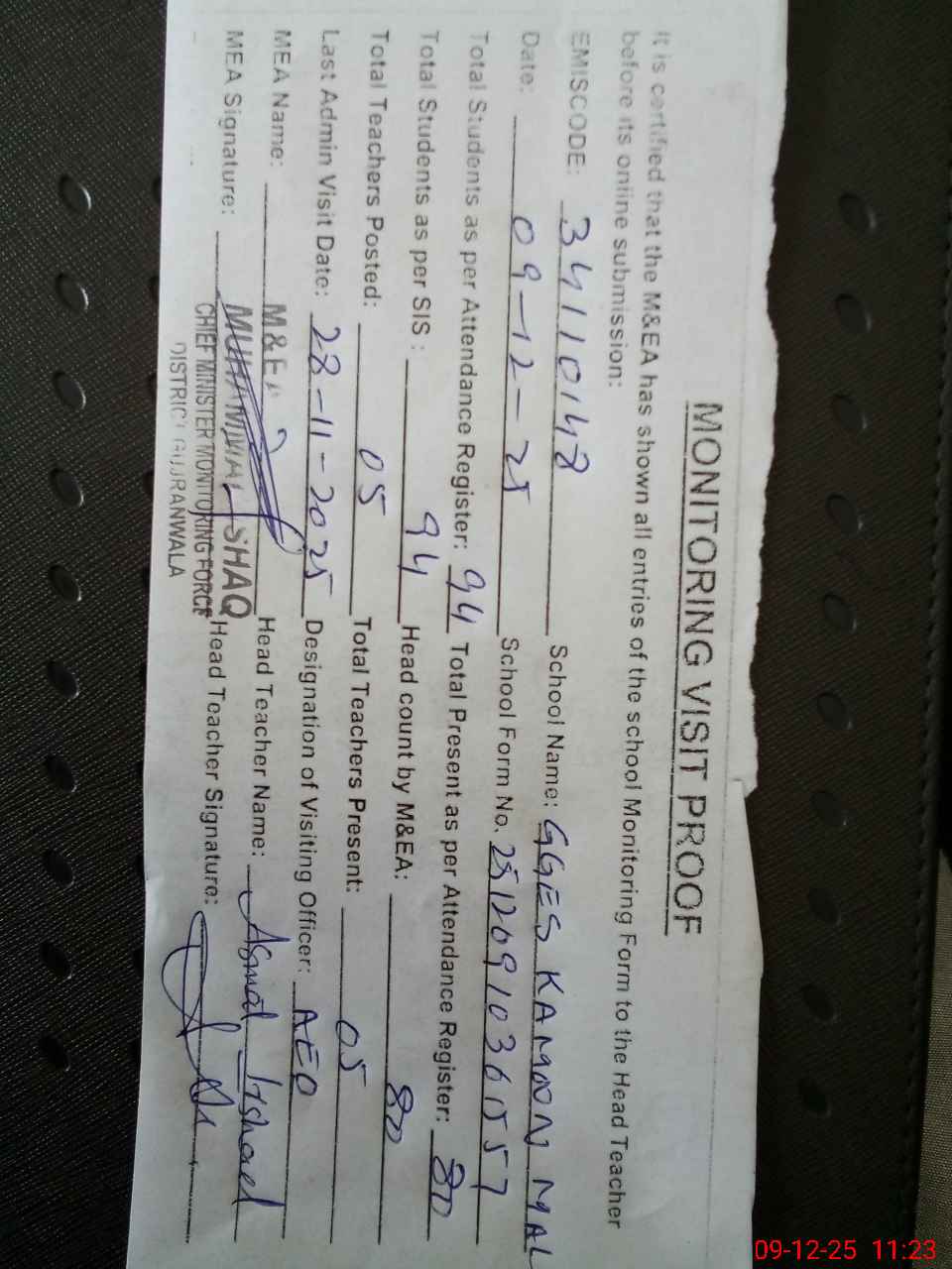 | Attendance Register | Head Teacher | MEA with School | Visit Proof |