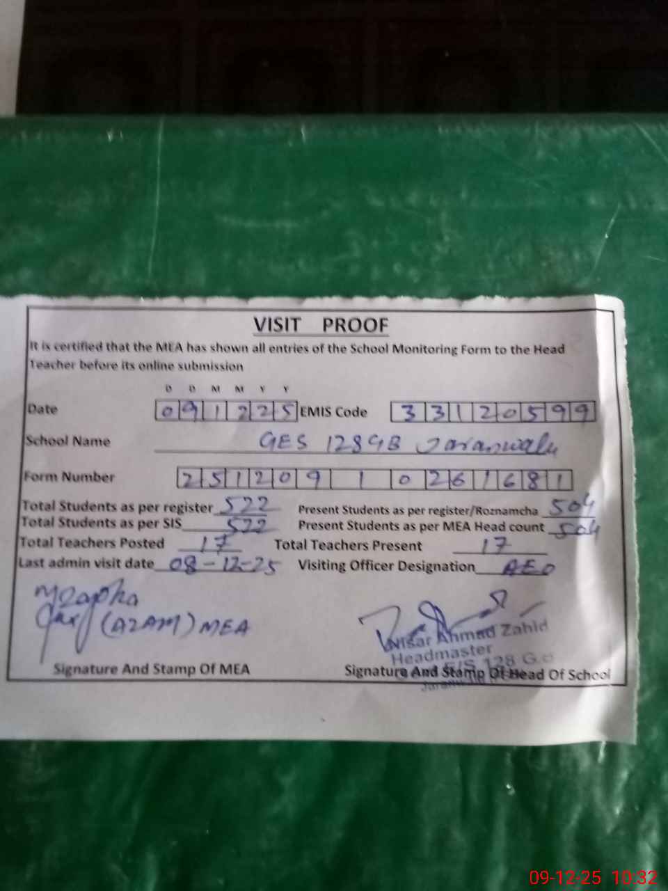 | Attendance Register | Head Teacher | MEA with School | Visit Proof |