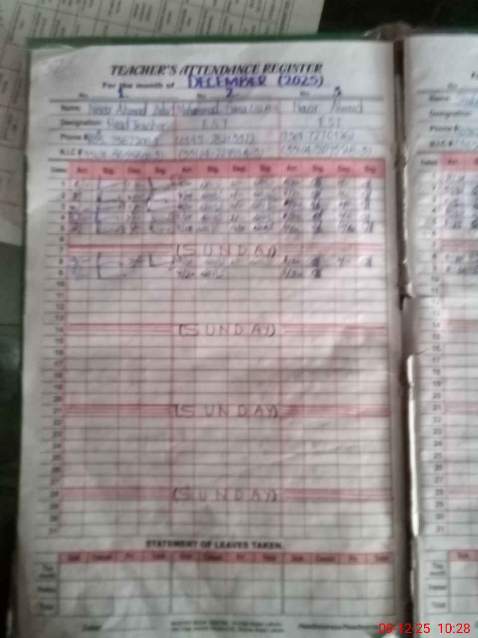 | CNIC | Full Name | Designation | R/C | Absence During Last Calender Month |