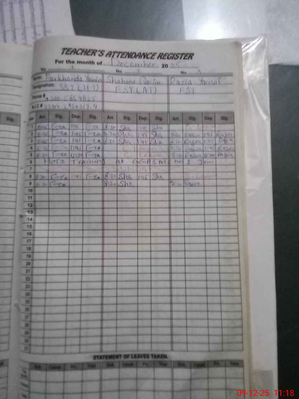 | CNIC | Full Name | Designation | R/C | Absence during last cal. month |
