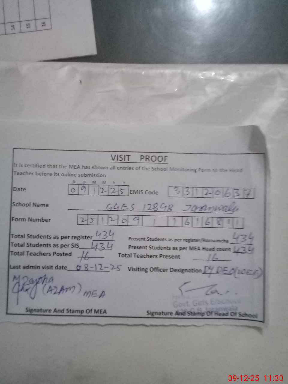 | Attendance Register | Head Teacher | MEA with School | Visit Proof |