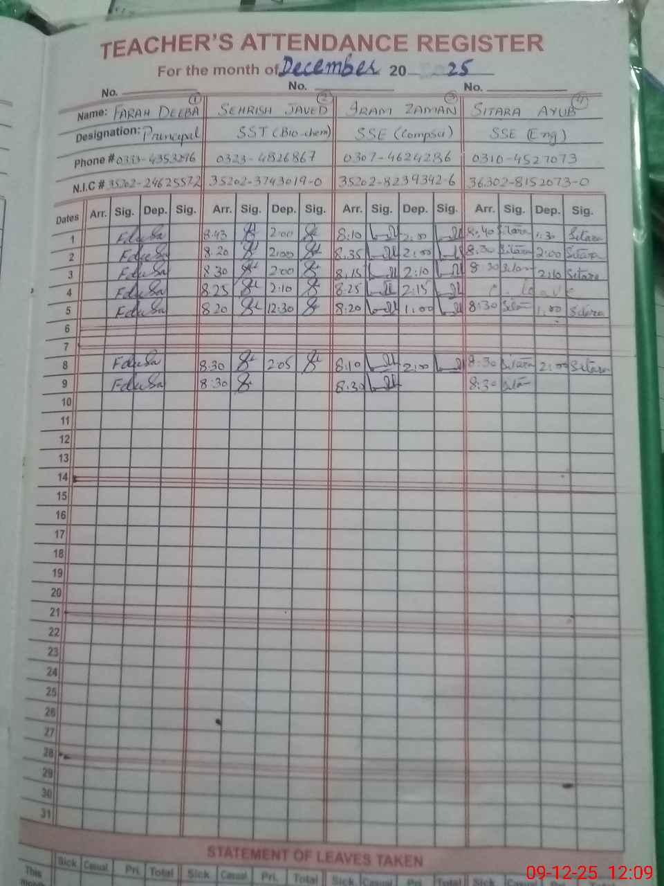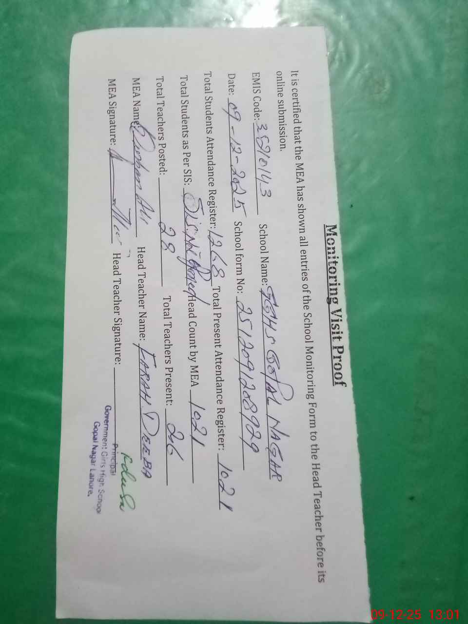 | Remarks (Use Separate Page if Required): Administrator visit of DEO 15th September 2025. Teacher Hina Asghar pst long absent wef 1st September 2025 to till today. Allah Rakha Mali on temporary duty in the office of CEO wef 19-02-2025 for 89 days but official duty letter Expired from 20th may 2025. after that mark him absent wef 20th may 2025 to till today. picture of official letter attached. | |||||