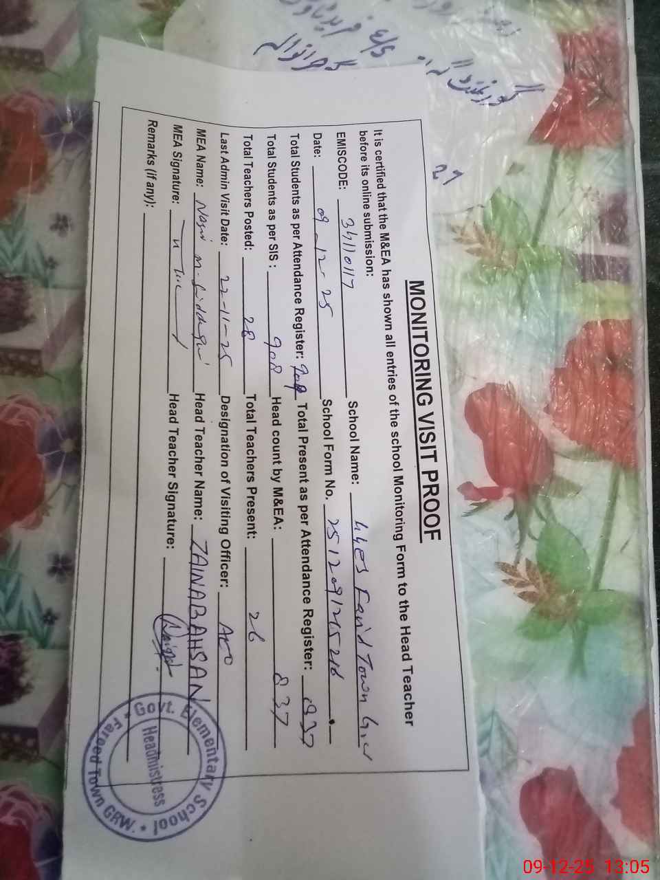 | Attendance Register | Head Teacher | MEA with School | Visit Proof |