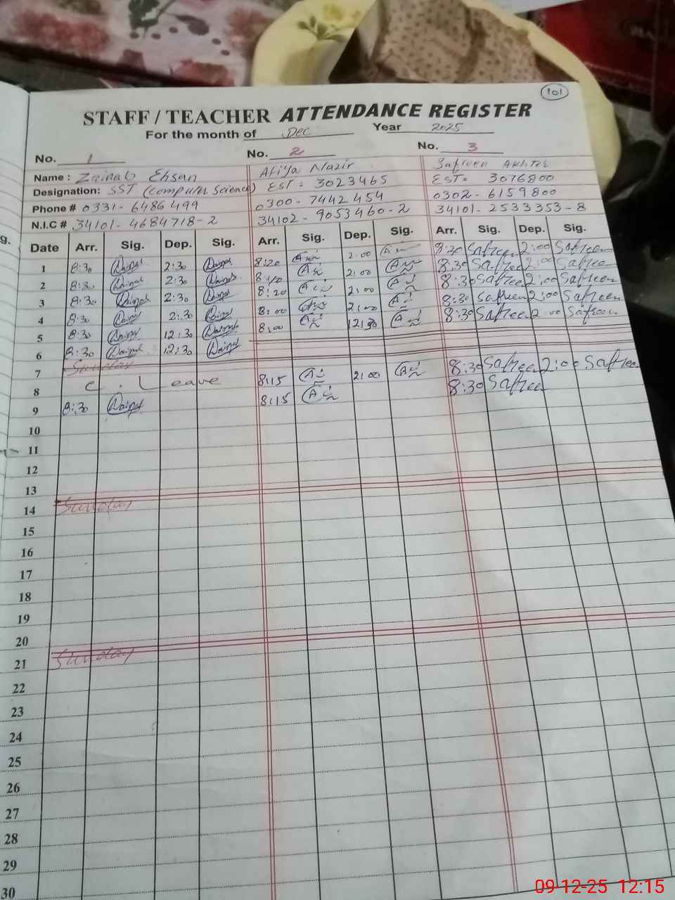 | CNIC | Full Name | Designation | R/C | Absence during last cal. month |