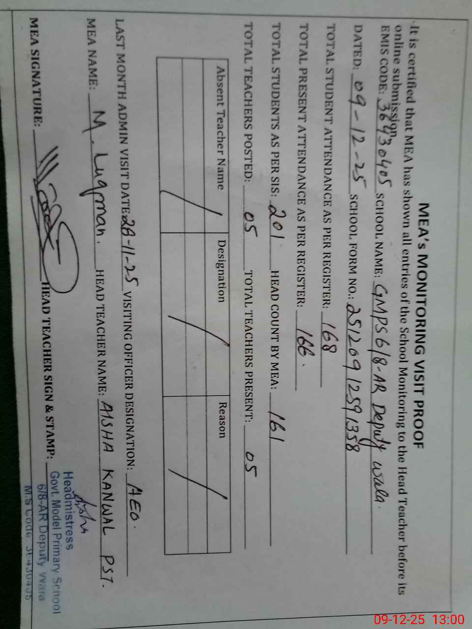 | Attendance Register | Head Teacher | MEA with School | Visit Proof |
