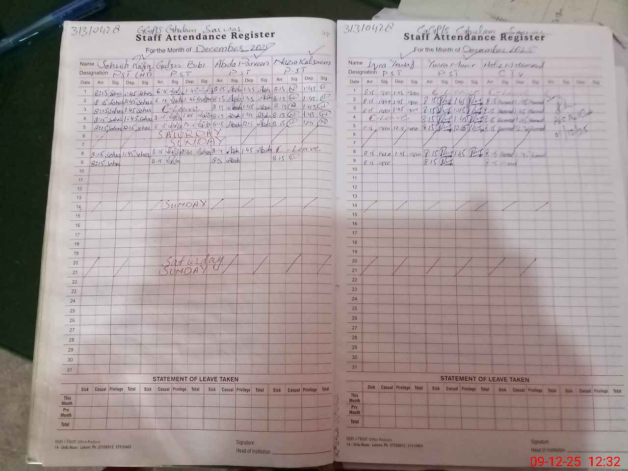 | CNIC | Full Name | Designation | R/C | Absence During Last Calender Month |