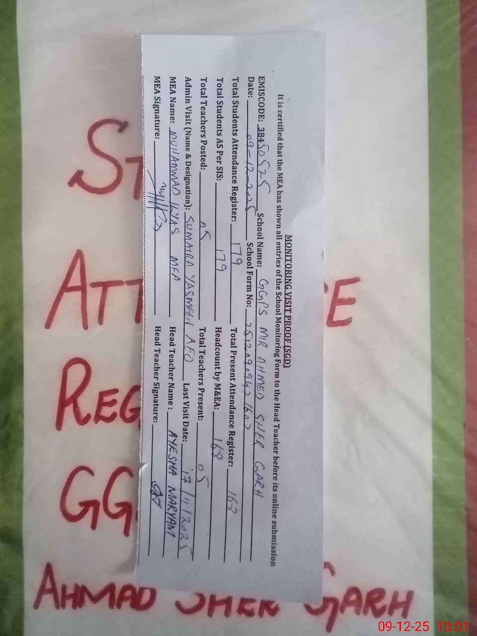 | Attendance Register | Head Teacher | MEA with School | Visit Proof |