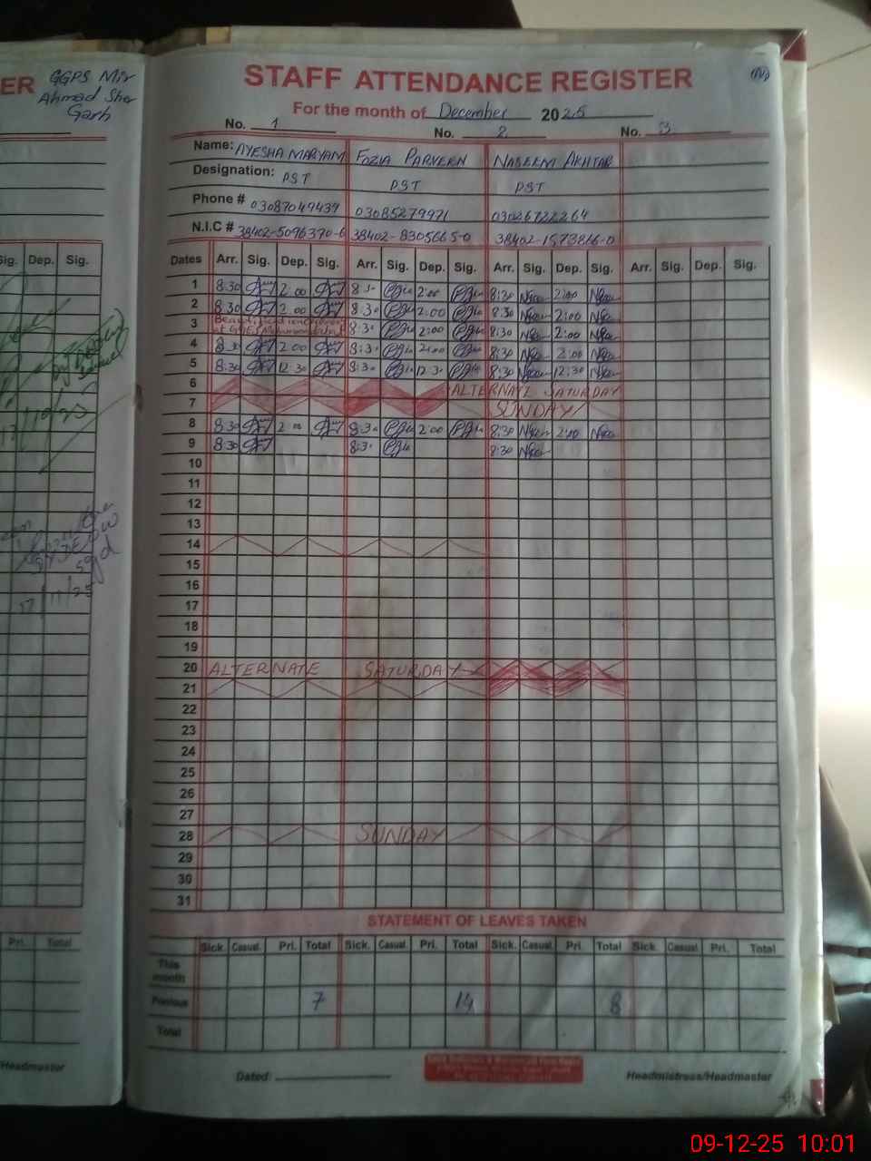 | CNIC | Full Name | Designation | R/C | Absence During Last Calender Month |