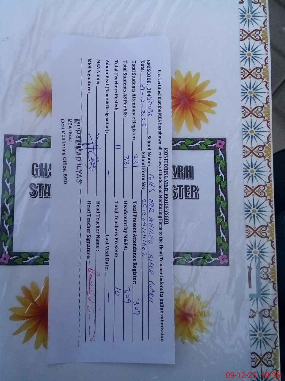 | EMIS Code: 38450030 | Name of School: GHS MIR AHMED SHER GARH | |||