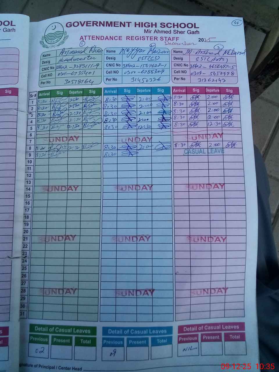 | CNIC | Full Name | Designation | R/C | Absence during last cal. month |