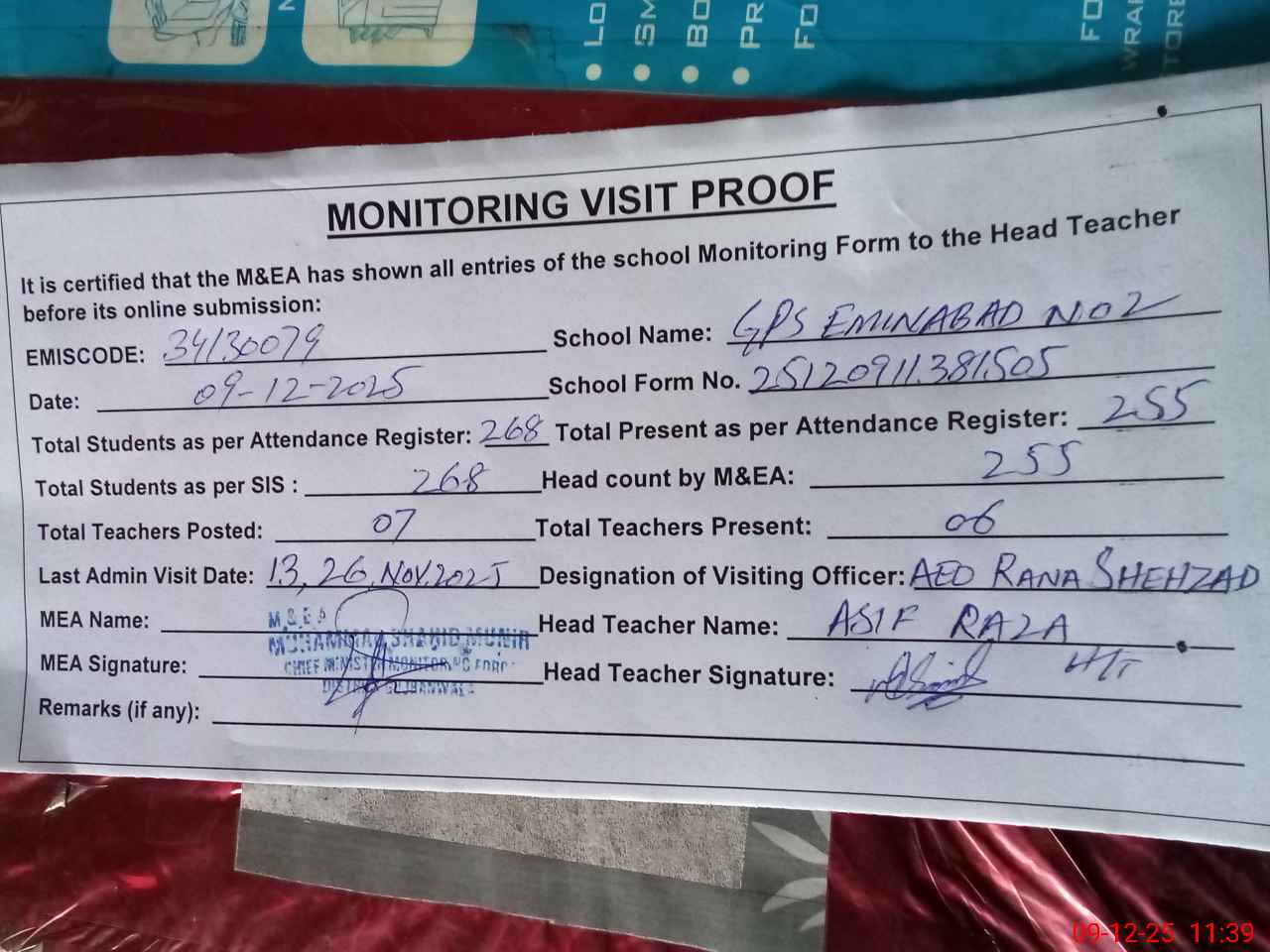 | Attendance Register | Head Teacher | MEA with School | Visit Proof |