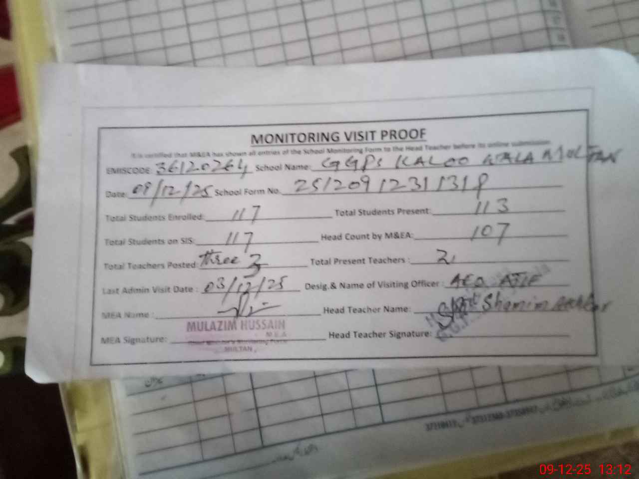 | Attendance Register | Head Teacher | MEA with School | Visit Proof |