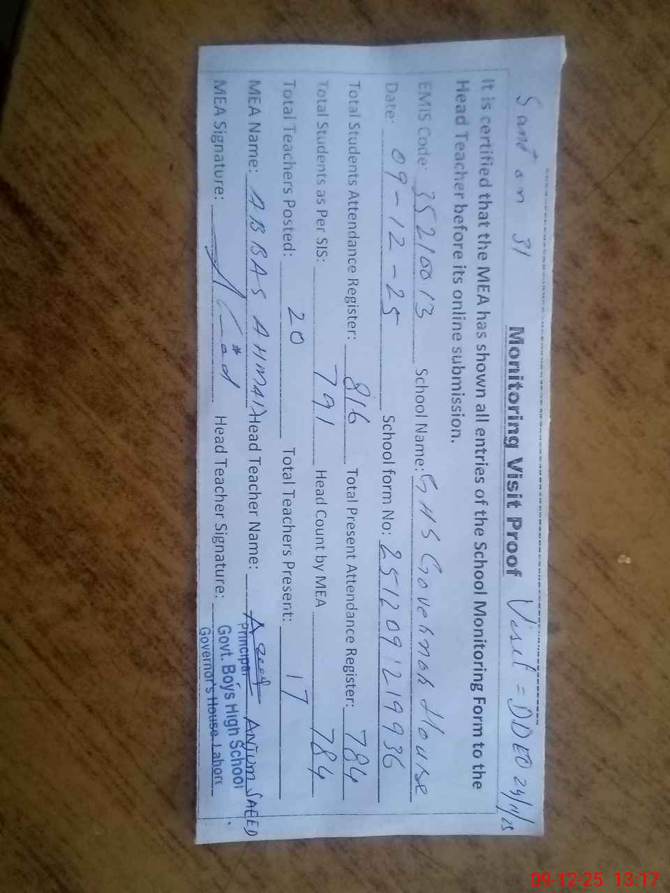| Attendance Register | Head Teacher | MEA with School | Visit Proof |