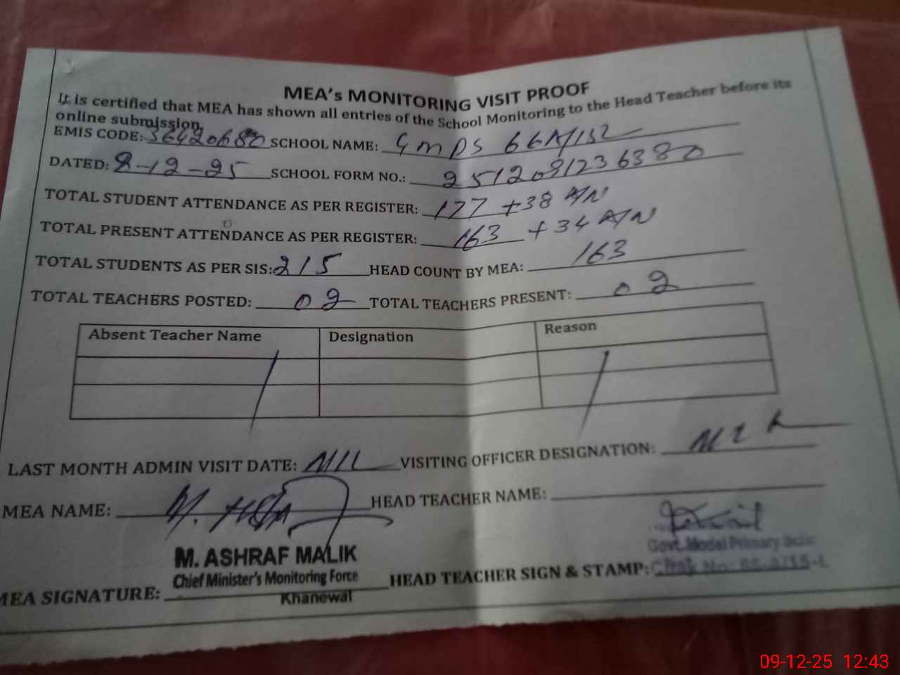 | Attendance Register | Head Teacher | MEA with School | Visit Proof |