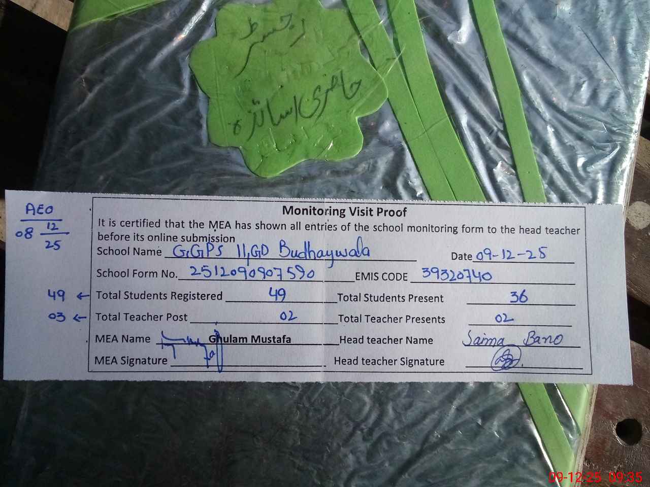 | Attendance Register | Head Teacher | MEA with School | Visit Proof |