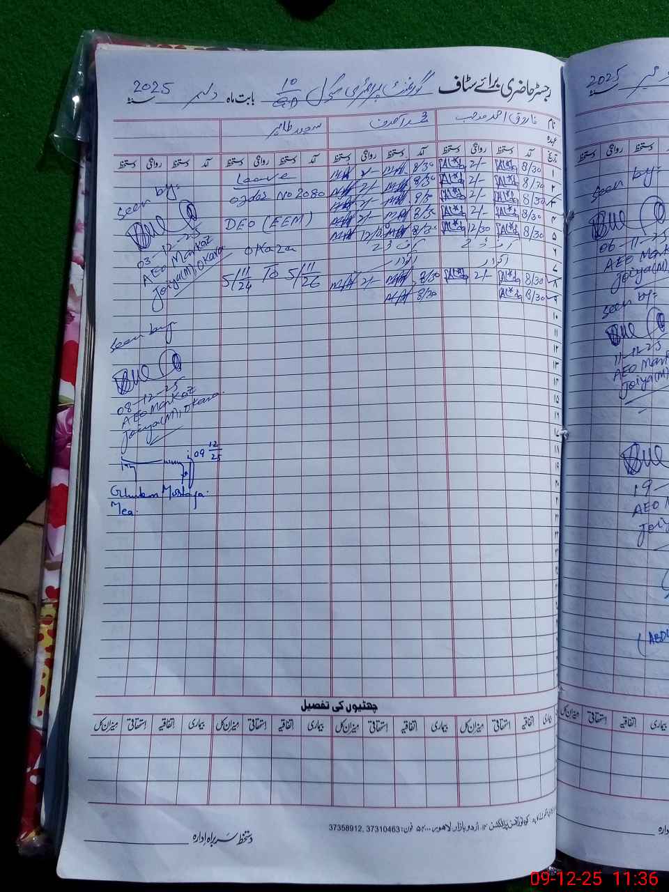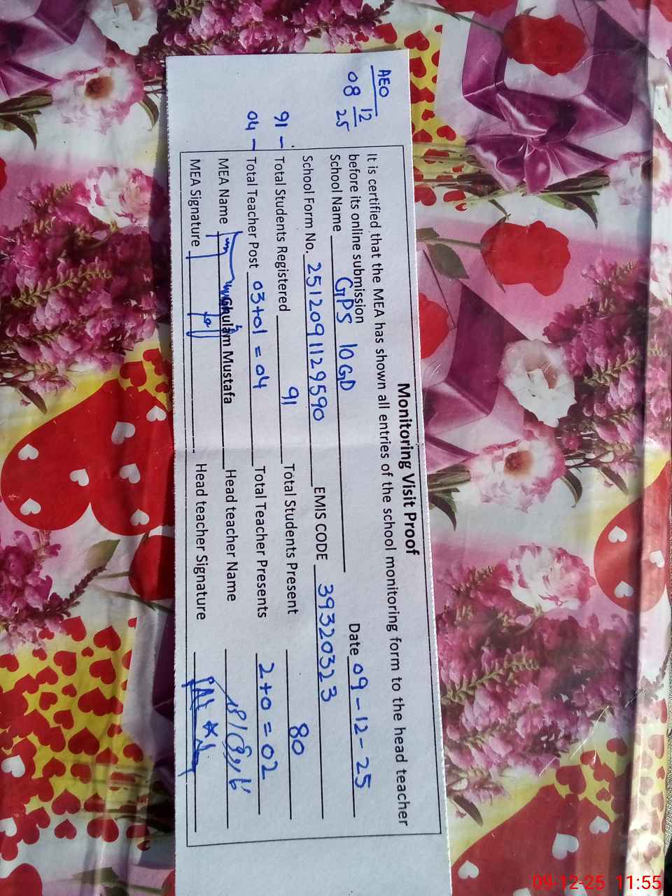 | Remarks (Use Separate Page if Required): Last visit by AEO on 08.12.25 It is pertinent to mentioned here that a feeder teacher also appointed named 'Asadullah' . Today he is on leave . | |||||