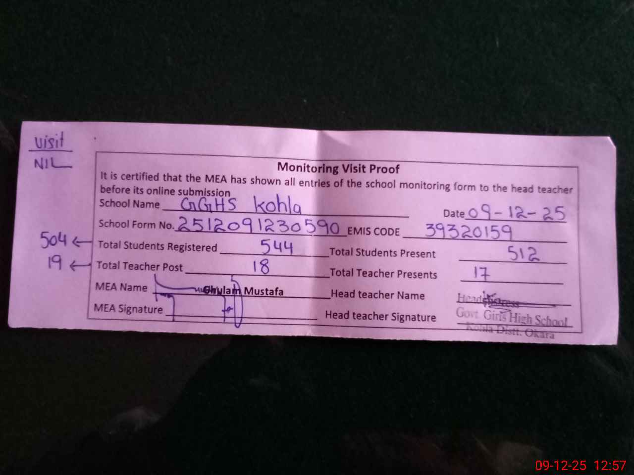 | Attendance Register | Head Teacher | MEA with School | Visit Proof |