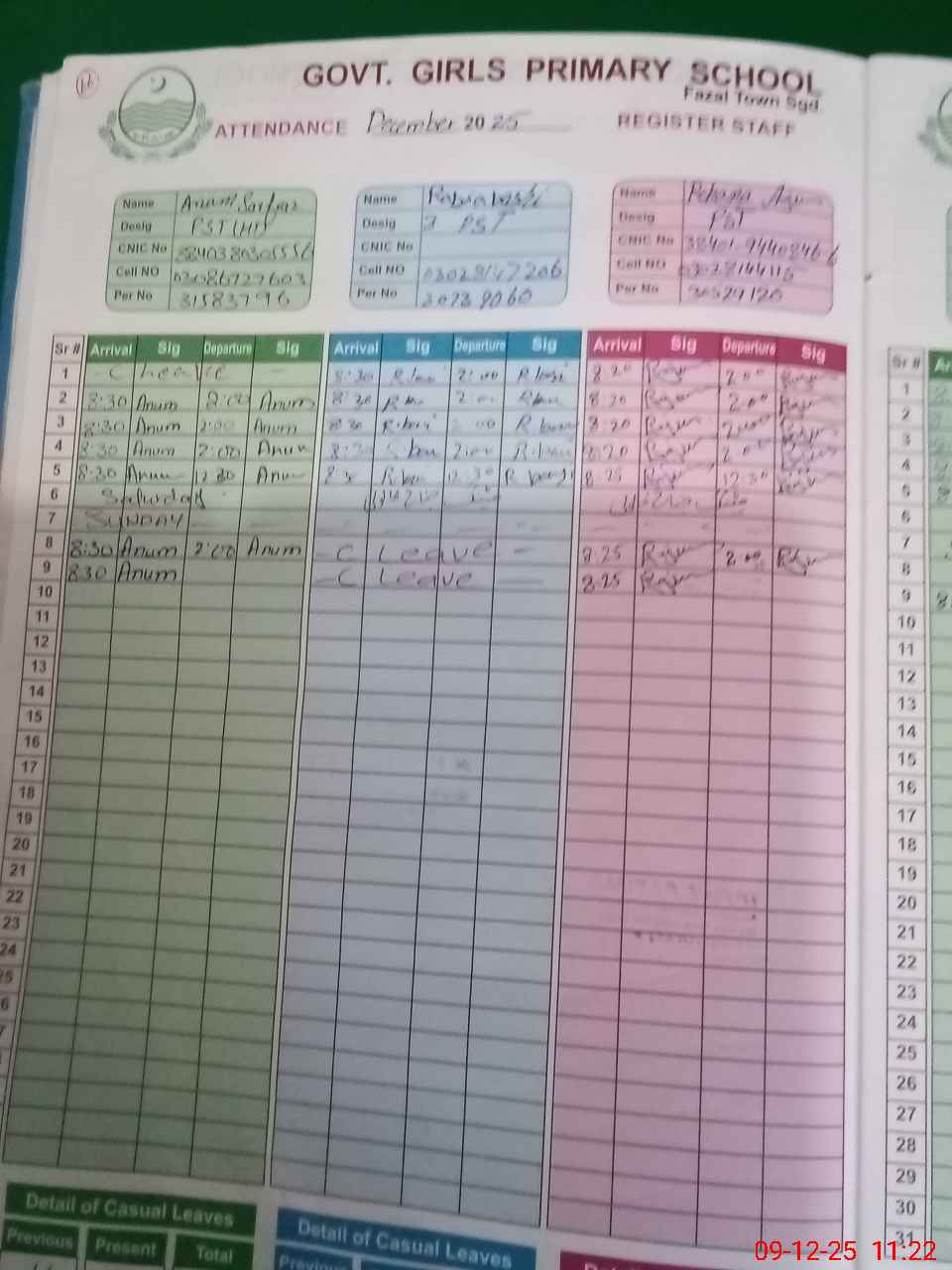 | CNIC | Full Name | Designation | R/C | Absence during last cal. month |