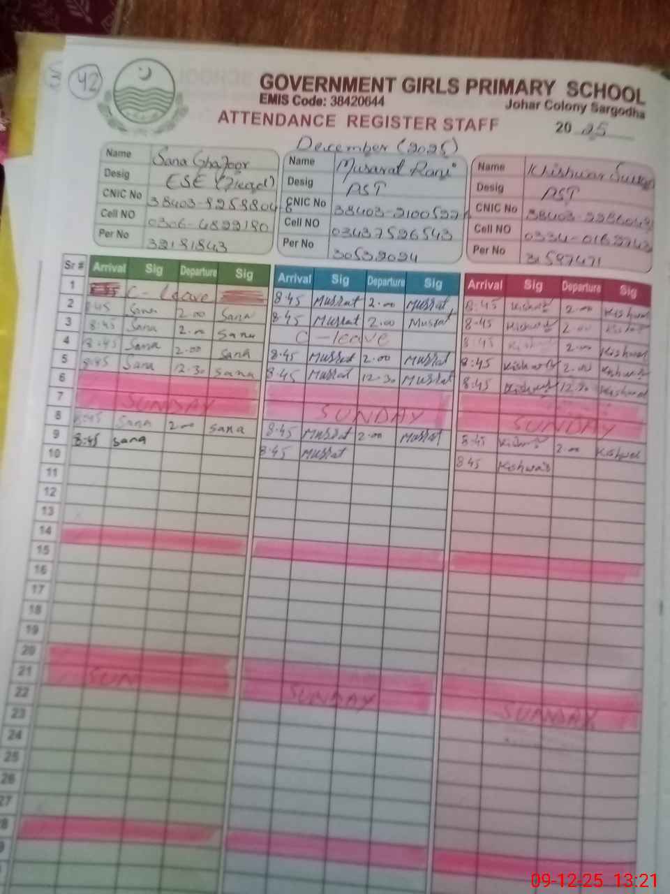 | CNIC | Full Name | Designation | R/C | Absence during last cal. month |