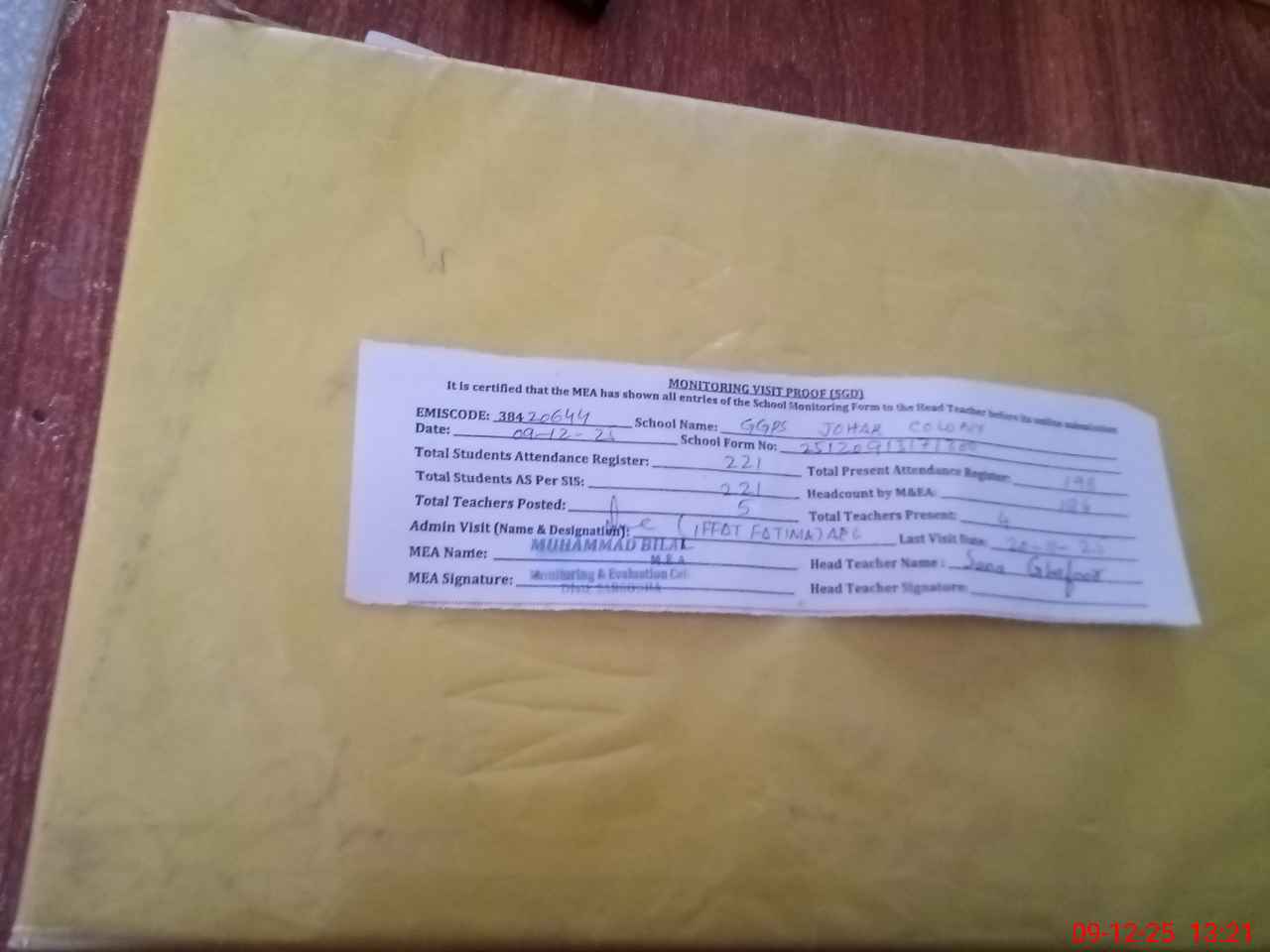 | Attendance Register | Head Teacher | MEA with School | Visit Proof |